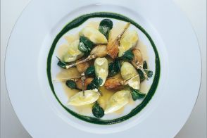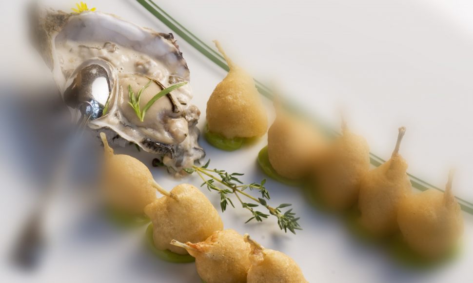 Tempura légère de cuisses de grenouilles en chaud et froid, un tartare "Terre et Mer"