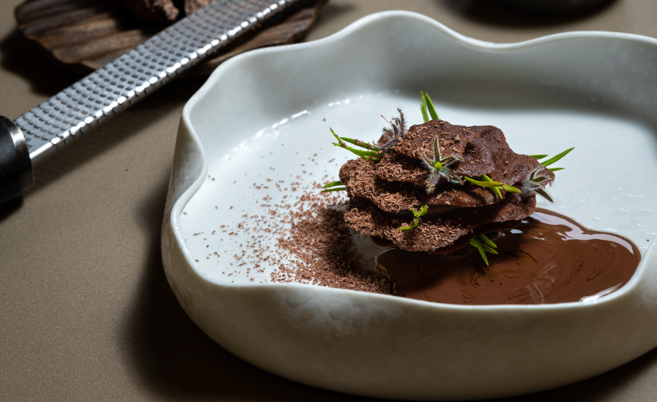 À travers cette création, le chef Stephan Paroche propose un dessert aussi original que captivant, né du terroir et de l’imagination. La Terre de l’Aubrac chocolatée marie la puissance du chocolat Belize à la fraîcheur saline des câpres – un mariage inattendu où les saveurs se confrontent pour mieux se sublimer. Ce dessert révèle toute l’audace et la finesse d’un chef en quête de contrastes et d’émotions.