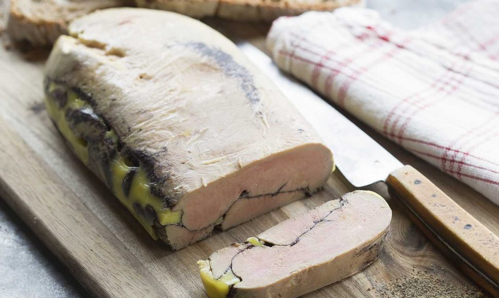 Une terrine de foie gras au poivre et cacao en poudre en cuisson rapide.