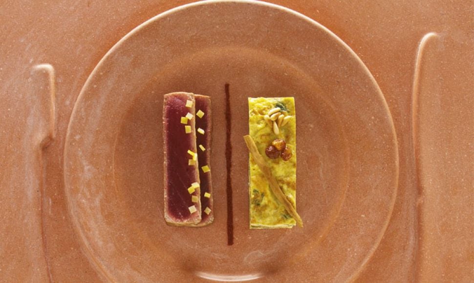 L’influence arabe se ressent dans cette recette avec l’importance du citron et la présence de la cannelle. Dans « Atun a la ibizenca », des œufs battus sont ajoutés au dernier moment dans le thon mariné au citron et poêlé. Nous avons imaginé de les interpréter en omelette.