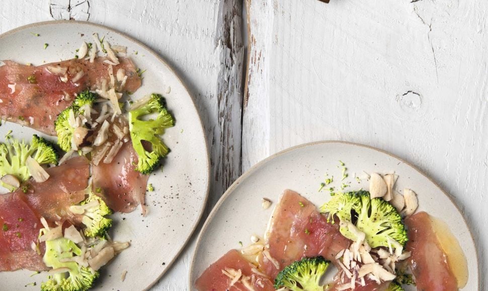 Taillez les têtes de brocoli à la mandoline au-dessus d’un plat de service. Taillez le thon de même (plus facile quand il est congelé) et répartissez joliment. Parsemez de noix du Brésil.