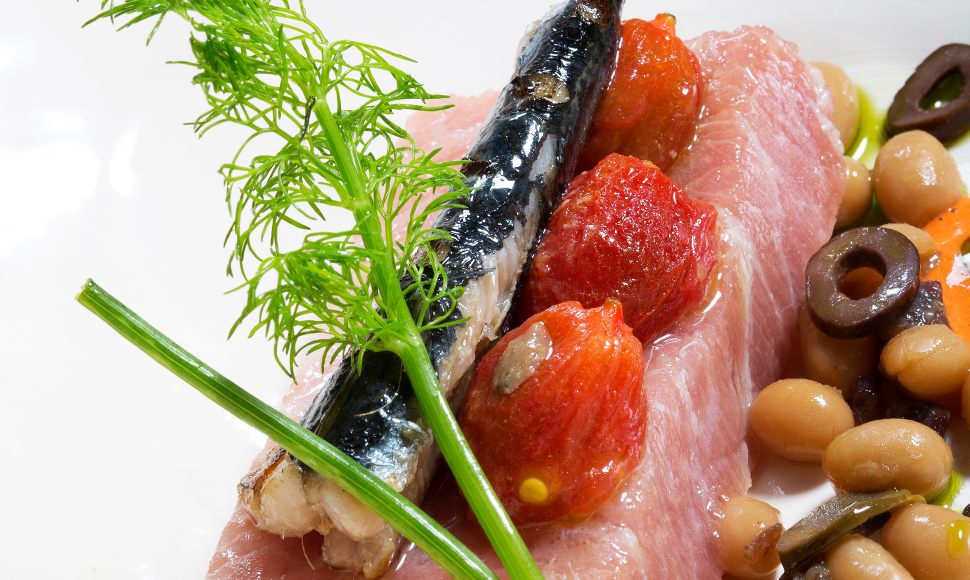 Dresser le risotto dans le fond de l’assiette, déposer le rouleau de thon rouge, ajouter les copeaux de bonite séchés et un filet d’huile d’olive.