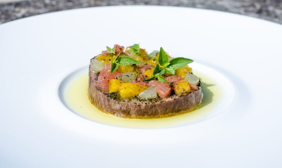 Poser la tranche de thon au centre l’assiette, disposer les agrumes dessus.