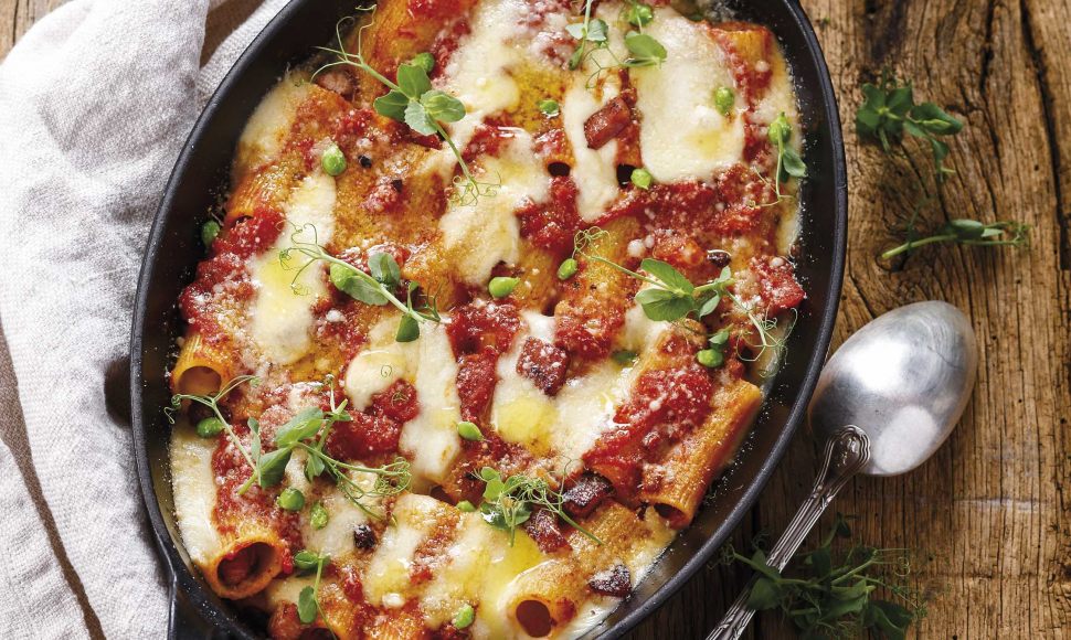 Un gratin de pâtes aux légumes et porc et bœuf haché au vin rouge avec une sauce tomate maison.