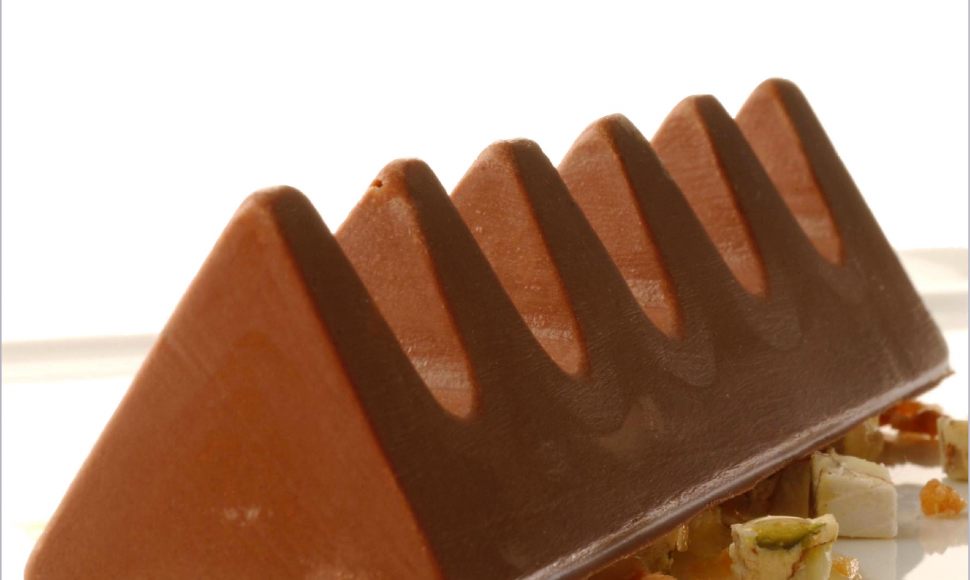 Prendre des moules en forme de barres Toblerone, les masquer à l’aide d’un pinceau avec de la couverture lactée tempérée en prenant soin de ne pas poser une couche trop épaisse. Laisser figer. Dans le fond des moules, déposer des morceaux de nougat finement taillés, puis ajouter la glace nougat au ras des moules. Bloquer au froid. À la sortie du froid, masquer de couverture lactée, en couche régulière, un morceau de papier sulfurisé de la dimension de la base du moule, appliquer le côté chocolaté sur la glace, remettre au froid.