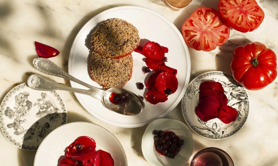 Les traditionnelles tomates à la provençale, revisitées avec une chapelure rose-cassis, et accompagnées d'une salade de roses.