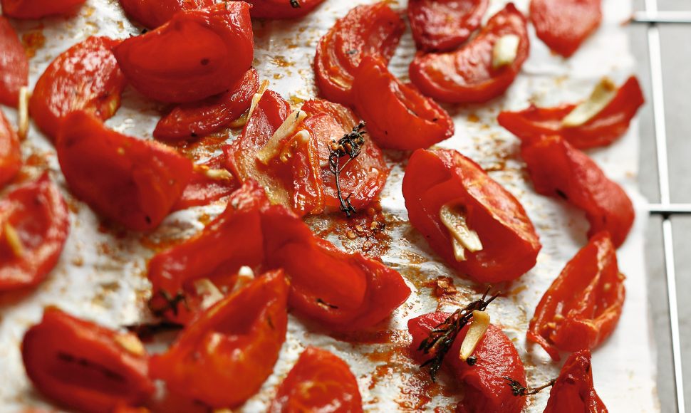 Mondez 1 kg de tomates grappes ou d’olivettes mûres. Coupez-les en quatre et retirez les pépins. Pelez 3 gousses d’ail. Préchauffez votre four à 100 °C (th. 3/4). Mettez les quartiers de tomates dans un saladier. Arrosez-les de 4 cuillerées à soupe d’huile d’olive et salez légèrement. Mélangez délicatement avec les mains afin que les tomates soient bien enrobées et assaisonnées. Coupez 1 gousse d’ail en deux et frottez-en la plaque du four, effeuillez dessus 4 branches de thym, puis étalez les quartiers de tomates en veillant à ce qu’ils ne se touchent pas. Versez tout le jus du saladier sur les tomates.