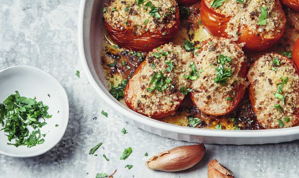 Des tomates accompagnées d'échalotes gratinées au parmesan et à la chapelure.