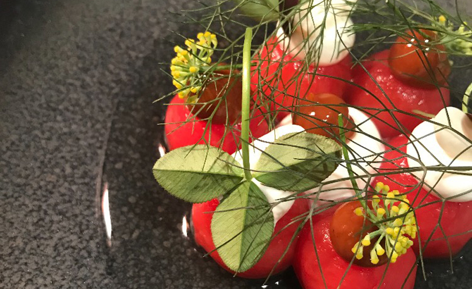 La Table du 11, vous connaissez ? Ce restaurant situé à Versailles, mené d'une main de maître par Jean-Baptiste Lavergne-Morazzani, est auréolé d'une étoile depuis 2016. Ce jeune virtuose qui a fait ses armes aux côtés de Simone Zanoni aime concilier tradition et modernité. En témoigne cette entrée qui associe avec élégance deux marqueurs forts de la cuisine italienne : la tomate et la burrata.