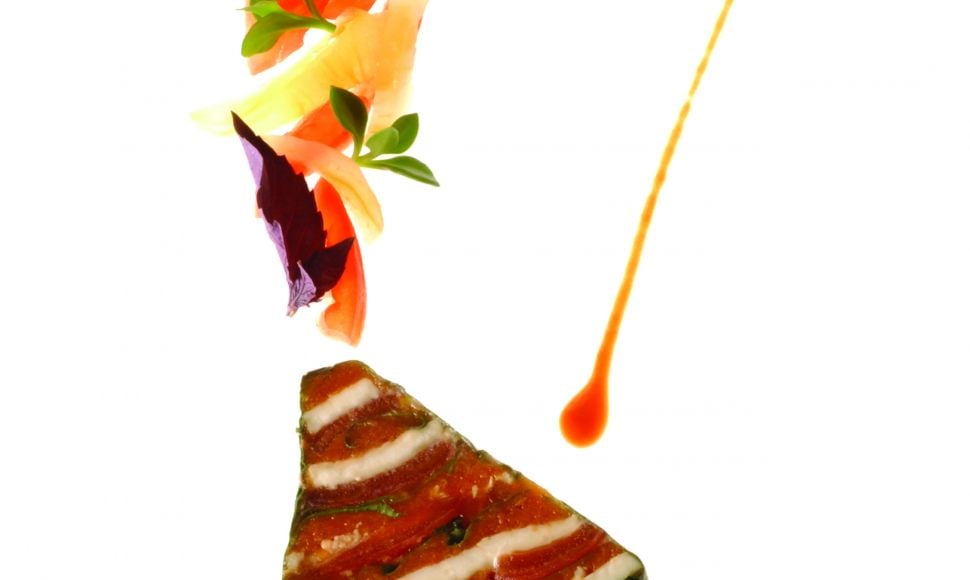 Tomates mozzarella di buffala, basilic en feuilles, suc de tomate vinaigré