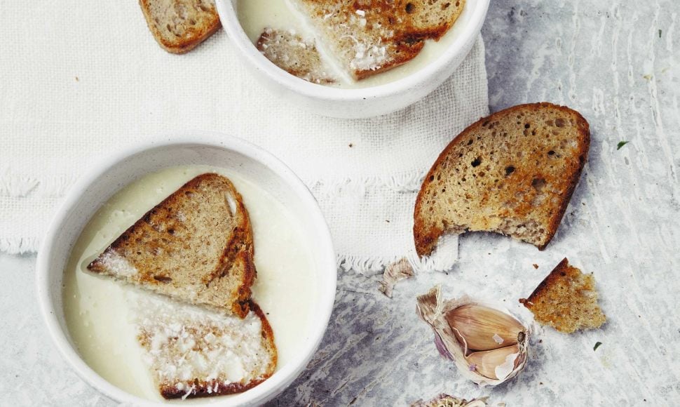 Une soupe à l'ail, à la graisse de canard et aux œufs clarifiés accompagnée de tranche de pain complet.