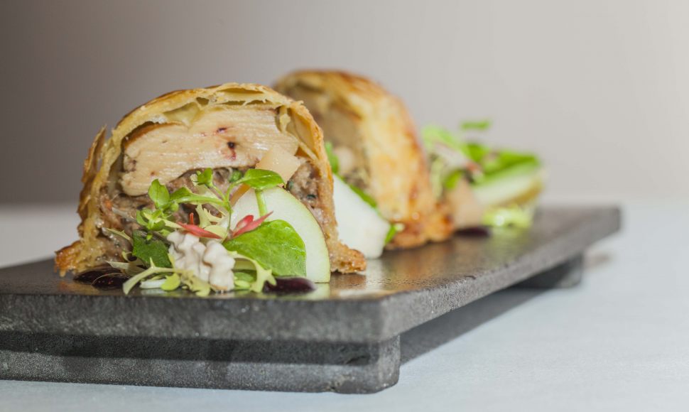 Tourte de canard au foie gras, salade de pissenlits, citron confit et girolles