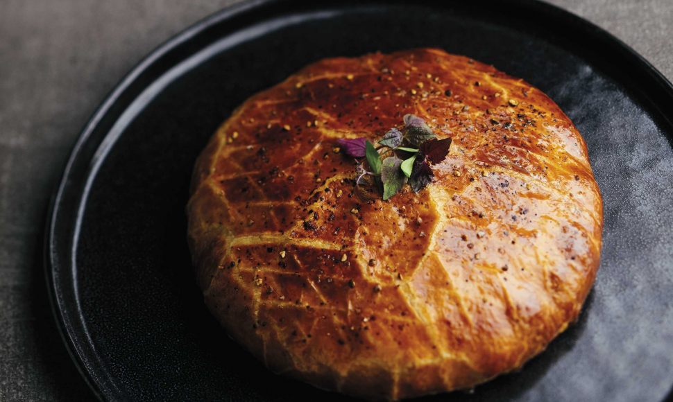 Abaisser la pâte feuilletée à 2,5 mm d’épaisseur. Tailler 2 disques de feuilletage de dimensions différentes (l’un de 20 cm et l’autre de 16 cm de diamètre par exemple) pour réaliser un montage inversé. Garnir le plus grand disque de feuilletage avec la mêlée. Recouvrir du second disque plus petit, rabattre les bords et retourner le montage. Dorer soigneusement et réserver à 3 °C pendant 3 h minimum.