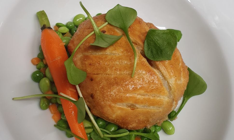 Dresser les légumes au fond de l’assiette, ranger la tourte puis verser de la sauce.