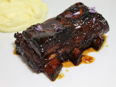 Saisir la viande dans une cocotte en fonte bien chaude. La fonte permet de bien marquer la viande. Ajouter le jus de viande puis le reste de la marinade et le fond blanc de volaille. Couvrir et porter à ébullition puis cuire dans un four préchauffé à 150°C pendant 1h30. Sortir ensuite du four et dresser sur assiette avec une quenelle de purée. Napper de jus de cuisson de la viande, décorer avec quelques fleurs de ciboulette et servir.