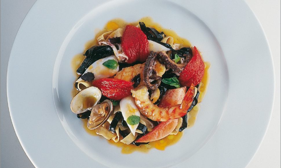 Passer la pâte à ravioli au laminoir, en descendant cran par cran pour ne pas abîmer sa texture. Couper des bandes de 20 cm de longueur et les passer au rouleau à nouille de 5 à 6 mm de largeur. Les saupoudrer de farine et les réserver sur un plateau.