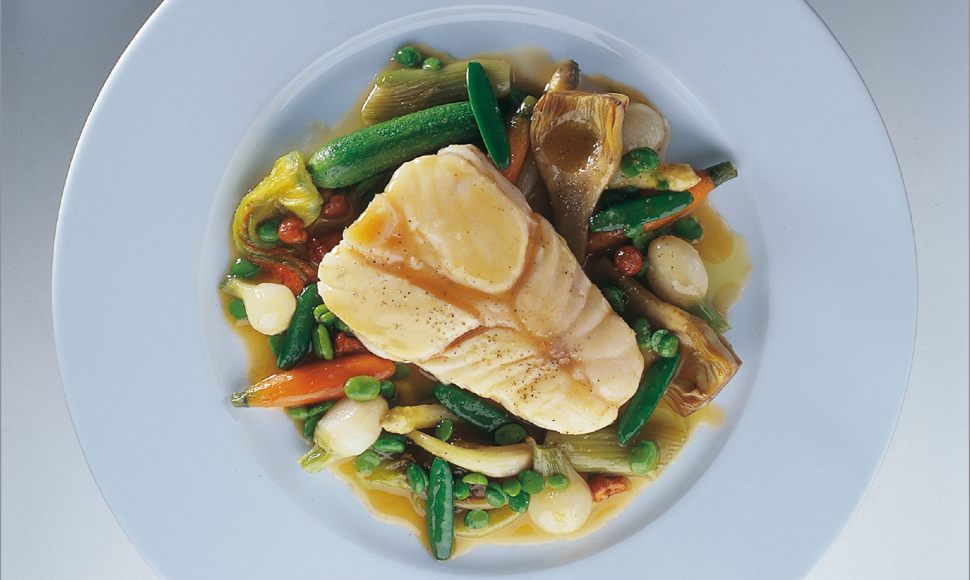 Tronçon de turbot cuisiné en cocotte à l’étouffée aux primeurs des paysans de provence