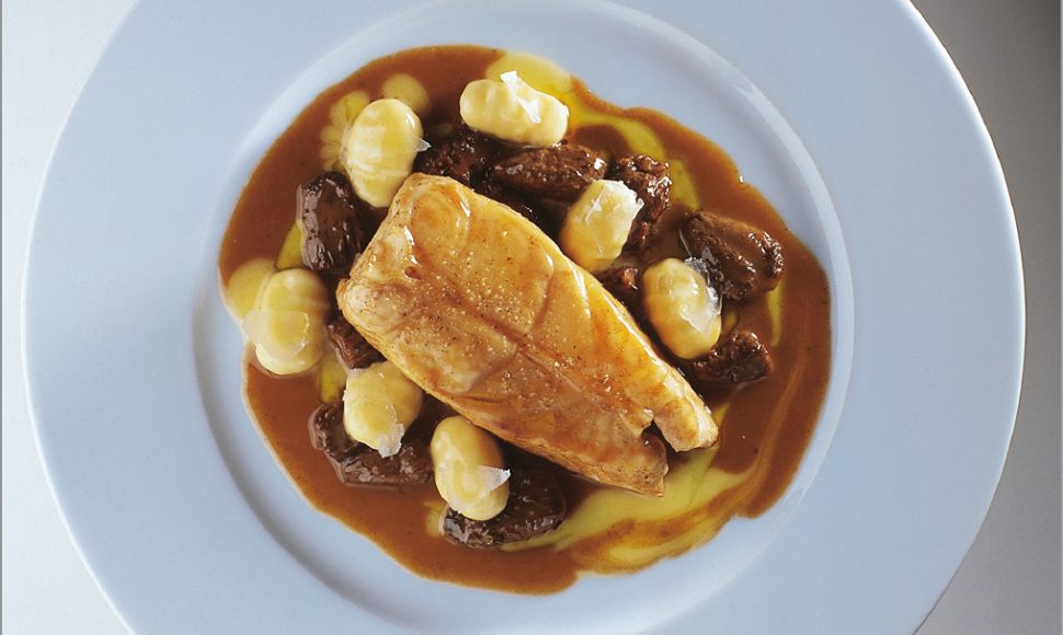 Tronçon de turbot cuit lentement pour être moelleux, morilles mijotées, gnocchi fondants de pomme de terre