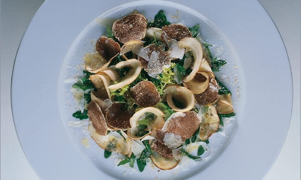 Truffe blanche d’alba, copeaux de cèpe et de vieux parmesan mêlés d’herbes et de salades assaisonnées d’huile d’olives très mûres