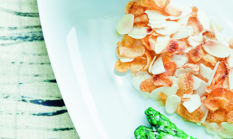 Dans un récipient, mélanger les amandes effilées et les corn flakes. Battre l’œuf dans un récipient. Au pinceau, en tartiner les filets du côté de la peau qui a été enlevée. Puis répartir régulièrement dessus le mélange amandes, corn-flakes. Réserver au frais.