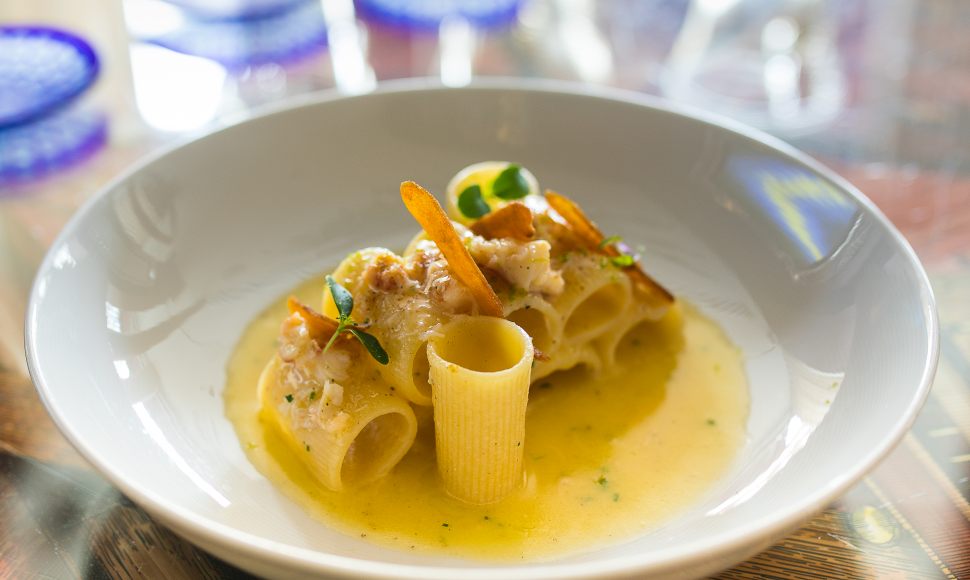 Des tufoli frais à la façon "cacio e pepe" accompagnés de chair d'araignée de mer iodée et tendre, une sauce crémeuse au pecorino et de la poutargue. Rien que ça.
