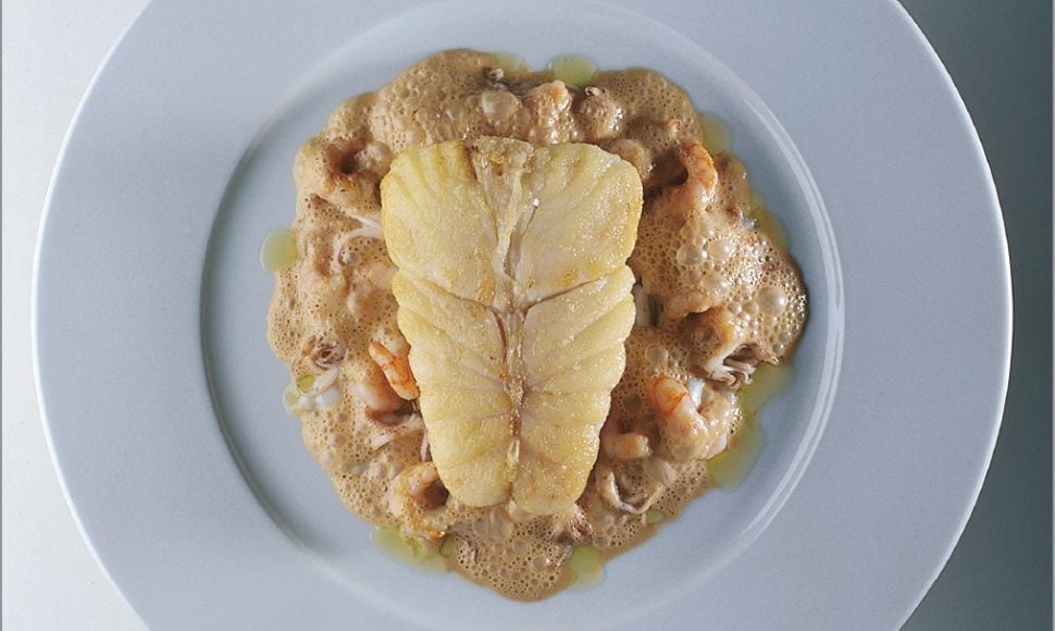 Turbot de bretagne au four, jus émulsionné aux crevettes bouquets