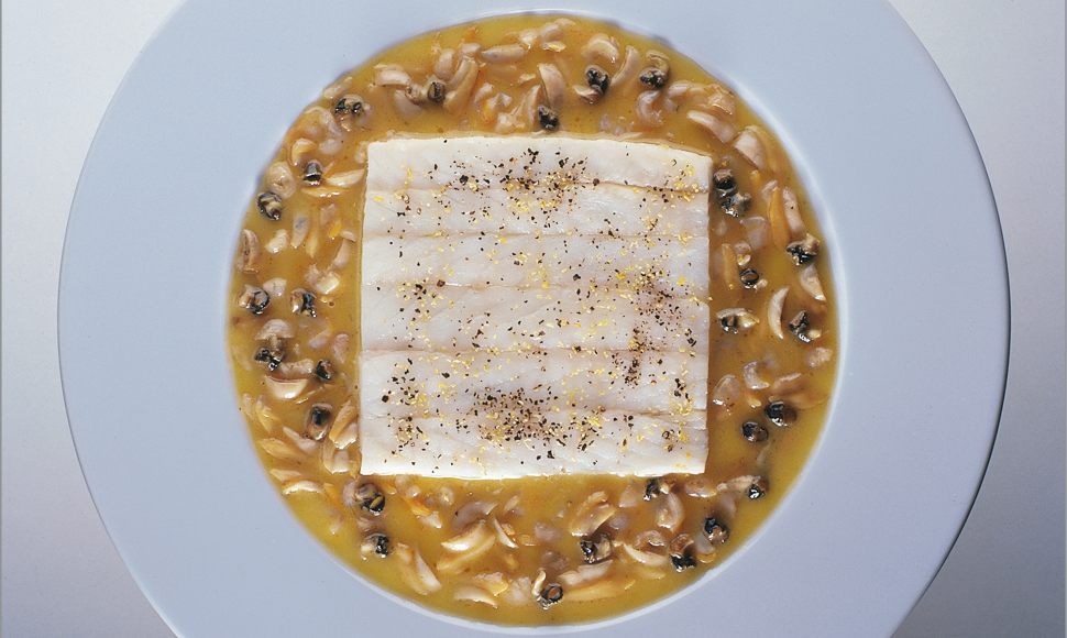Turbot de bretagne en filets à plat, coquillages, sucs au beurre demi-sel