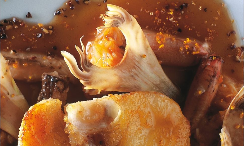 Turbot de bretagne mariné aux écorces d’agrume, artichauts violets et chair d’araignée de mer en salade tiède