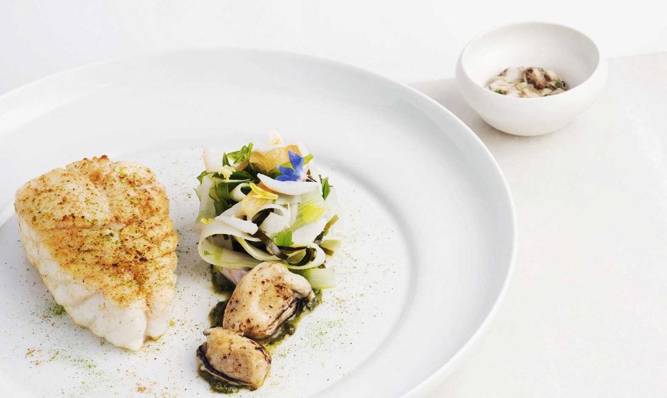 Turbot du golfe de gascogne, livèche et bourrache, huîtres juste tiédies