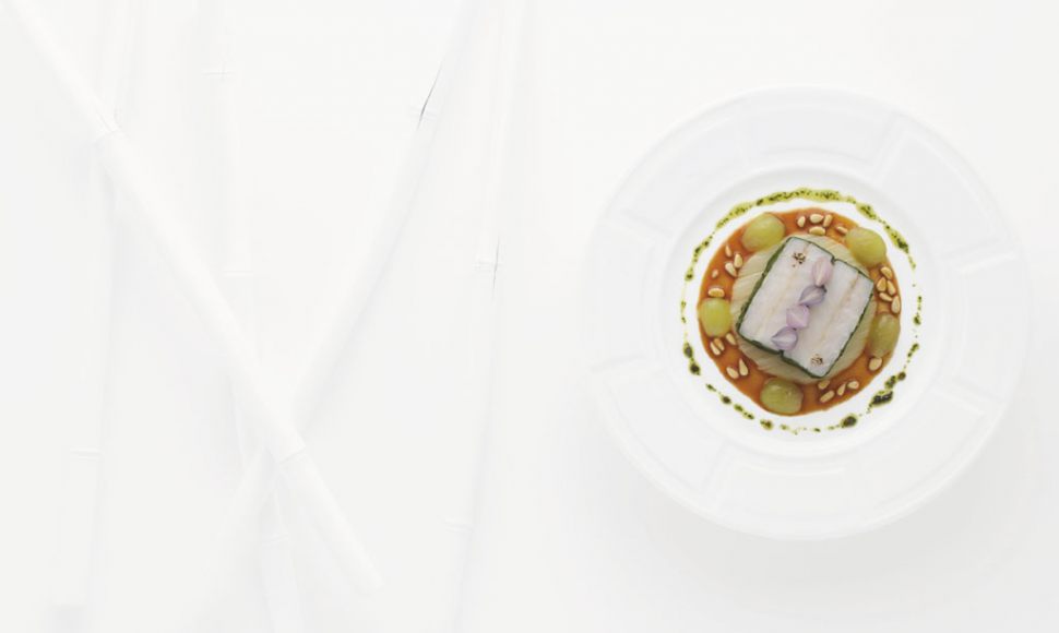 Turbot rôti, vert et blanc de blettes pignons, oignons et raisins