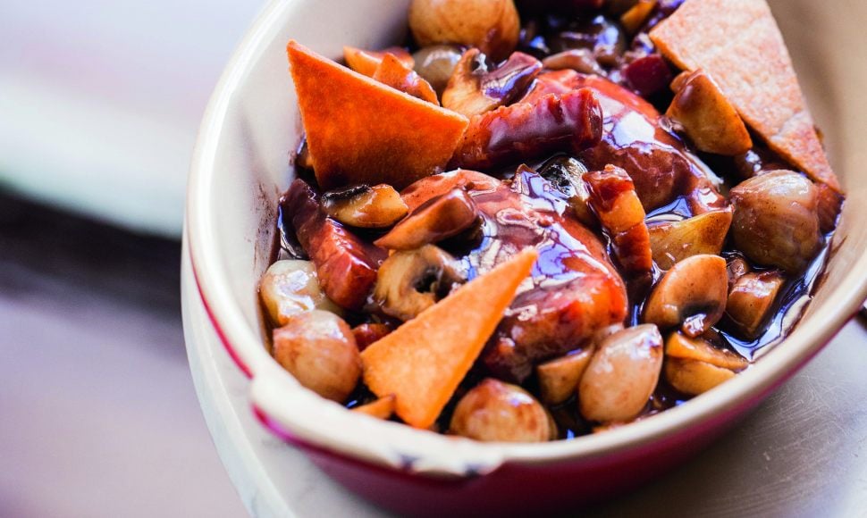 Détaillez le lard en petits lardons. Épluchez les oignons, puis équeutez et lavez les champignons. Dans une cocotte, faites fondre le beurre et ajoutez les lardons. Laissez-les dorer, puis ajoutez les oignons grelots pour qu’ils caramélisent. Ajoutez les champignons, l’ail et le thym, et laissez cuire pendant 10 min en remuant de temps en temps.