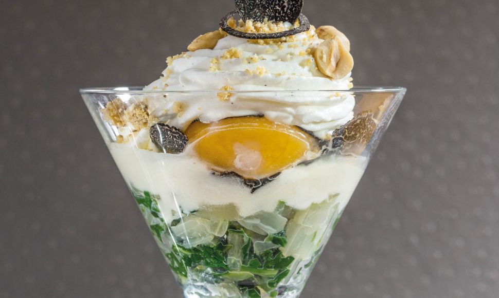 Œuf parfait, mousseline de topinambours et blettes streusel noisettes, schum au parmesan