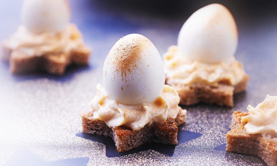 Cuire les œufs de caille 4 minutes, les laisser refroidir et les écaler. Griller les tranches de pain de seigle et découper des étoiles avec un emporte-pièce. Pocher une noisette de chantilly sur le pain en forme d’étoile. Déposer un œuf de caille et souffler dessus de la poudre dorée pour recouvrir les œufs.