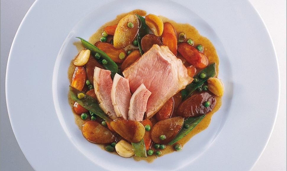 Une côte de veau de lait fermier épaisse avec son gras, des pommes en copeaux, carottes et cosses de pois parfumées d’ail nouveau en gratin