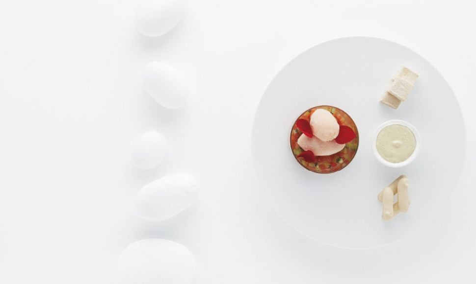Vacherin décomposé au goût de fleur d’oranger, glace à la rose et fruits parfumés