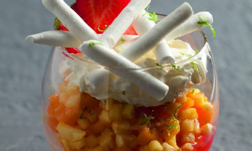 Déposez une couche de crème fouettée dans les récipients de présentation. Répartissez dessus la brunoise de fruits. Déposez de la crème fouettée.