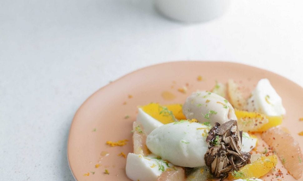 Une association de fromage, sorbets et fruits frais pour des saveurs sucrées-salées légères.