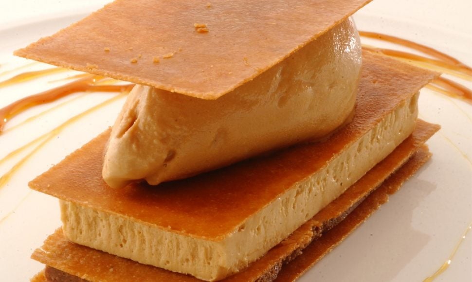Réunir le lait, les jaunes d’œufs et 100 g de sucre semoule. Les mélanger, les cuire au bain-marie à 84 °C. À part, ébouillanter la crème fleurette. Confectionner un caramel avec le reste du sucre semoule, puis le déglacer avec la crème chaude.
