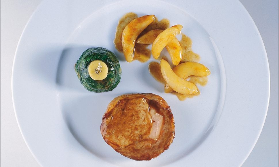 Dégraisser et dénerver partiellement la viande, qui doit conserver son aspect d’origine. Supprimer tous les os, tailler 4 tranches de 220 g pièce et les ficeler afin de les maintenir au cours de la cuisson.