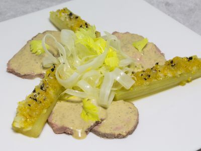 A la fin de la cuisson, refroidir immédiatement le filet de veau et les céleris. Récupérer les feuilles du cœur de céleri. Tailler le cœur en fins copeaux à l’aide d’une mandoline. Dans un récipient, rassembler les copeaux et les feuilles de céleri, verser ensuite les jus d’agrumes, l’huile d’olive et assaisonner de sel. Mélanger puis égoutter légèrement. Une fois le filet de veau complètement refroidi, enlever le film alimentaire et ôter les herbes. Tailler ce dernier en douze tranches régulières.