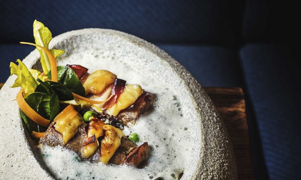Un jarret de veau braisé, fondant en bouche, on varie la nature des champignons selon la saison, utilisant tantôt des cèpes tantôt des morilles, des truffes ou des champignons de Paris.