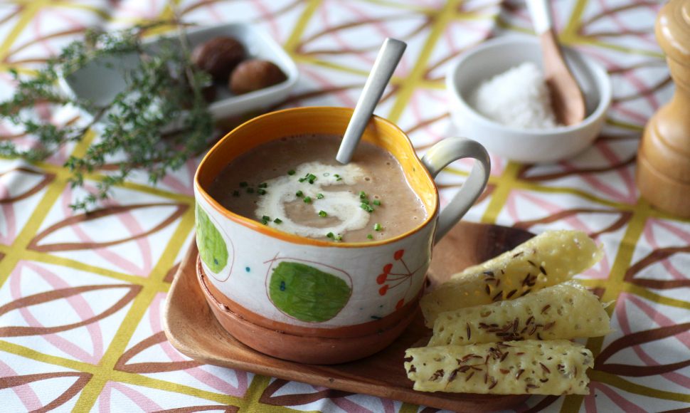 Emincer l'oignon et le faire revenir dans l'huile chaude. Ajouter les marrons égouttés puis saler et poivrer. Verser le bouillon de légumes puis faire mijoter à feu doux pendant 30 minutes.