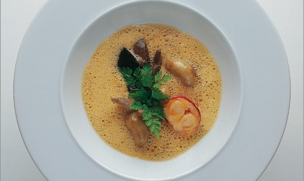 Velouté de crustacés en infusion de cèpes et morilles au cerfeuil