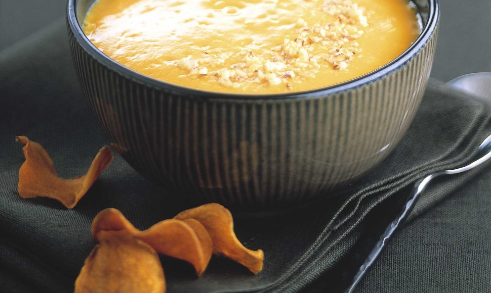 Un velouté qui associe les notes sucrées de la patate douce, celles épicées du curry et le croquant des noisettes hachées.