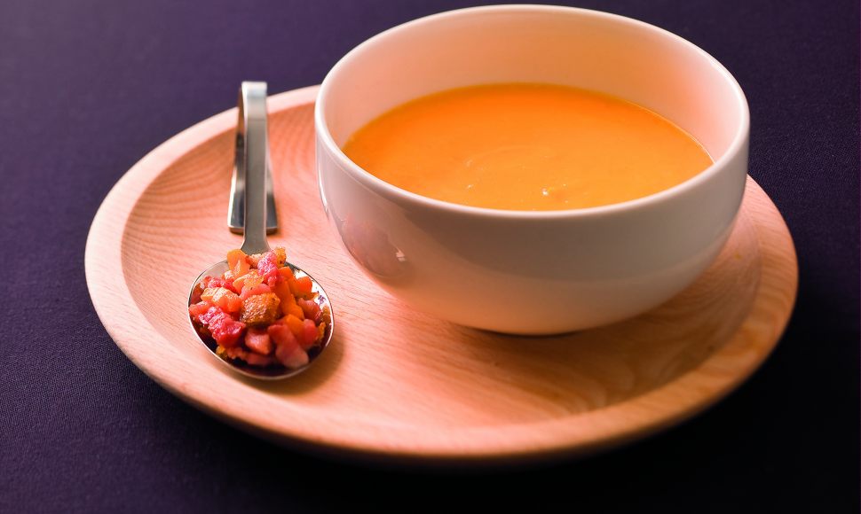Réalisez avec l'École de Cuisine Alain Ducasse un grand classique des petits plats d'automne : le velouté de potiron. Le potiron, les pommes de terre et la carotte entremêlées à l'oignon et à la vanille font de cette soupe vitaminée un véritable délice. Servez ce plat accompagné de lardons revenus à la poêle avec des dés de pain pour lui offrir relief et gourmandise. Succès garanti.
