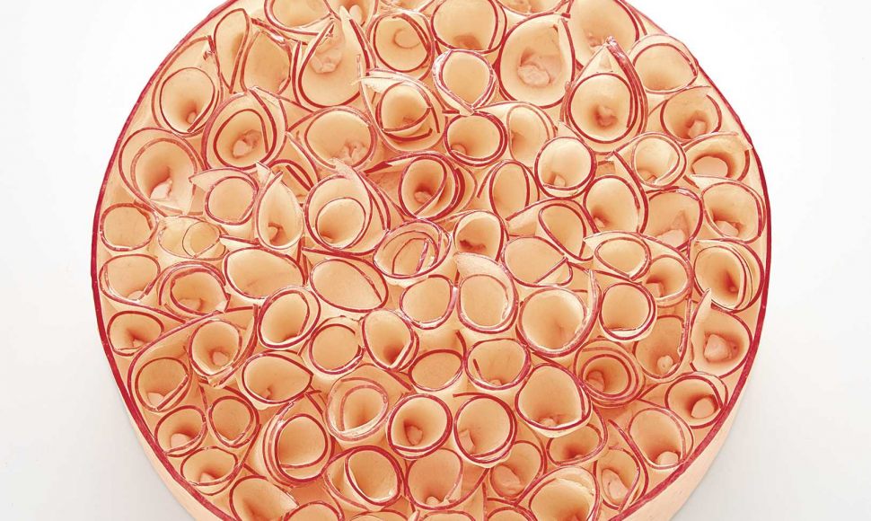 Faites tremper la gélatine dans de l’eau très froide pendant au moins 20 min. Mélangez les jaunes d’œufs avec le sucre. Dans une casserole, portez la crème à ébullition, puis versez-la sur le mélange précédent. Fouettez et remettez dans la casserole avant de faire cuire jusqu’à 85 °C comme une crème anglaise. Ajoutez alors la gélatine égouttée, le sirop et l’essence de rose. Mixez au mixeur plongeant et stockez 12 h au réfrigérateur.