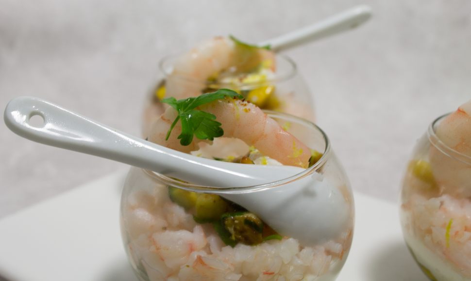 Verrines de courgettes ricotta pimentée aux crevettes