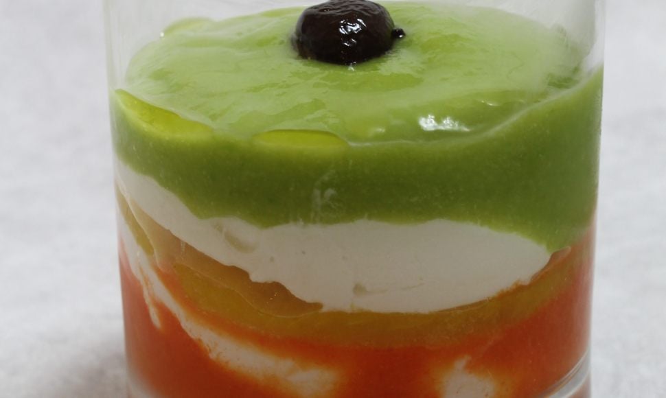Éplucher les poivrons avec un couteau économe. Les couper en 2, éliminer les graines et les cloisons. Puis tailler chaque moitié en brunoise. Chauffer un filet d’huile d’olive dans une casserole et y faire suer les dés de poivrons rouges pendant 5 minutes. Assaisonner de sel. Mouiller avec la moitié du fond blanc de volaille et cuire encore 10 minutes. Débarrasser les poivrons dans le bol du mixeur et les mixer jusqu’à consistance lisse. La réserver. Cuire et mixer de même les poivrons verts.