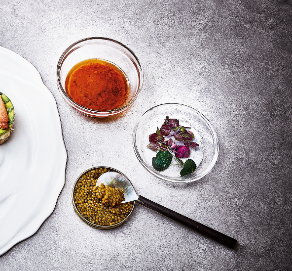 Mélangez le vinaigre de bonite avec l’huile d’olive, les épices saté, les zestes de citron jaune et de citron vert râpés à la Microplane®*. Assaisonnez avec du sel et du poivre du moulin.