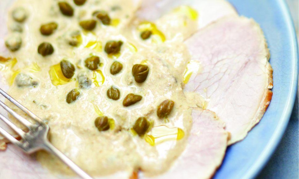Retirez-les de la cocotte, ajoutez l'huile d'olive restante et faites dorer le rôti sur toutes ses faces à feu moyen. Ajoutez le pied de veau, les oignons, le thon et les anchois égouttés. Ajoutez également le jus de 1,5 citron, le vin blanc, 15 cl d'eau, ainsi que le thym et le laurier. Salez, poivrez bien, couvrez et laissez mijoter pendant 1 h 30 à feu doux. À la fin de la cuisson, retirez le rôti du feu et laissez-le refroidir dans sa sauce.